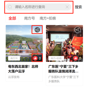 2.进入“粤来粤好百千万”展示界面后,可通过浏览你喜欢的作品点赞;可在搜索栏输入你支持的作品编号或标题关键信息,锁定你喜欢的作品,点击图片右下方点赞标志助力(点击查询作品编号);也可点击图片右上角分享按钮转发邀请朋友、群友点赞。