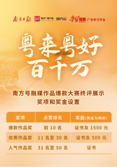 为生动展现广东“百千万工程”的丰硕成果与澎湃活力,由南方日报、南方+客户端和“学习强国”广东学习平台联合主办的“粤来粤好百千万”南方号融媒作品爆款大赛,将于10月28日启动终评展示。经过激烈角逐,共有238件精品力作脱颖而出进入本轮比拼。大赛设置150个奖项和5万奖金,还将评选出优秀组织单位奖若干,奖项到底花落谁家?一起来助力吧!